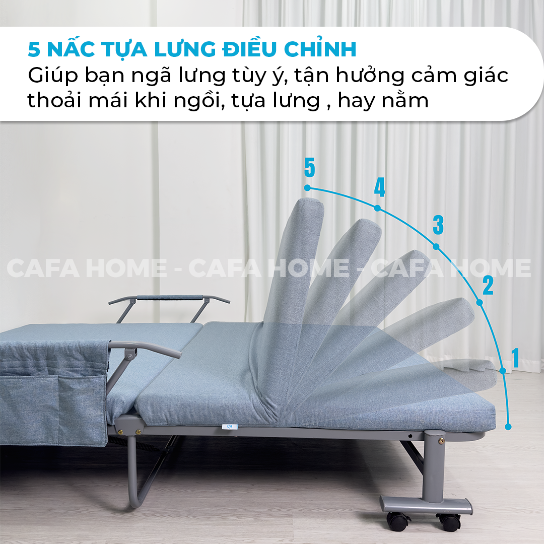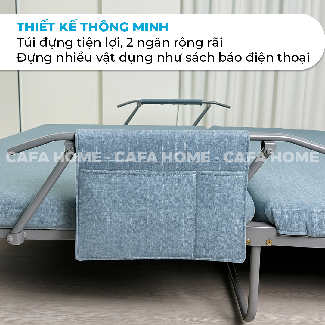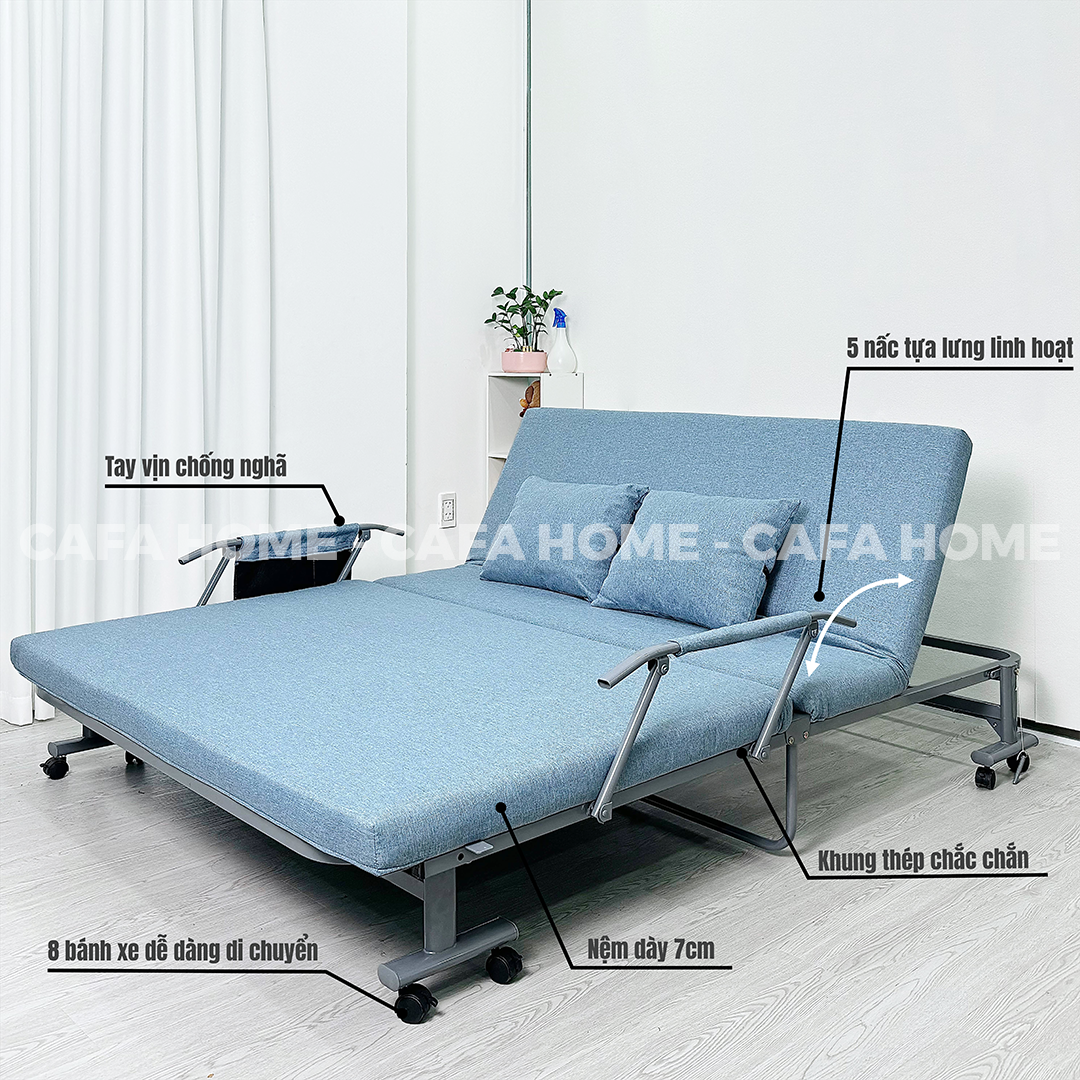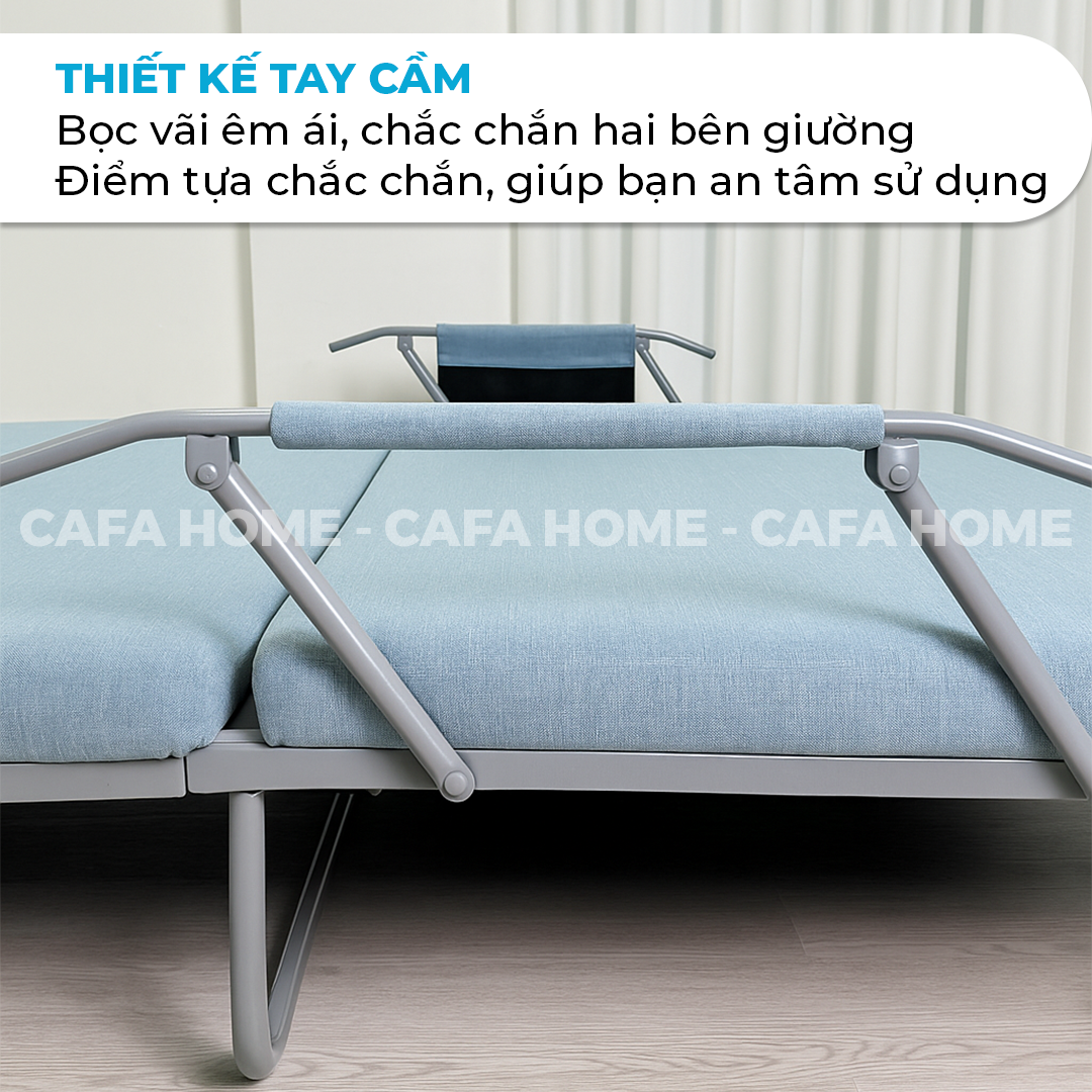 Với thiết kế thông minh, kiểu dáng gấp gọn hiện đại, Giường Gấp Tay Vịn CAFA là lựa chọn lý tưởng cho những không gian hạn chế như căn hộ nhỏ, phòng trọ, chung cư, hay văn phòng làm việc. Sở hữu kích thước rộng rãi ngang 150cm, mẫu giường này 2 - 3 người lớn nằm thoải mái, mang lại sự tiện nghi vượt trội mà vẫn đảm bảo tiết kiệm diện tích tối đa. Giường được trang bị tay vịn chắc chắn, khung kim loại chắc chắn, kết hợp với thiết kế dễ dàng gấp gọn và có bánh xe di chuyển, giúp bạn linh hoạt bố trí ở nhiều không gian khác nhau.